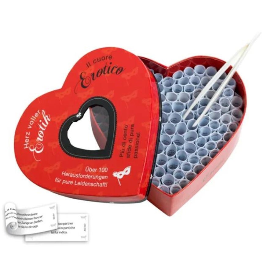 Überrasche deinen Schatz mit über 100 Herausforderungen für pure Leidenschaft! Das Herz voller Erotik ist ein sinnliches Spiel für Paare. Zieht mit der Pinzette eines der Röllchen aus dem Herzen und seit gespannt was ihr alles erleben werdet. Eine spielerische Verführung, ein erregendes Vorspiel oder doch eine erotische Herausforderung?